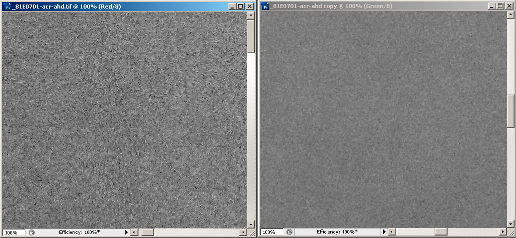 Adobe Camera Raw does not have any methods to control demosaicing by the user. The noise is very similar in character to AHD implementation found in dcraw, however it has a little more fuzzy appearance. The noise in the red channel is lower than the one originating from dcraw. However, the green channel also appears more fuzzy. In the green channel we can also see low frequency noise, which obviously was added there from the red channel. It should be noted that the other two raw converters do not exhibit this effect at all.